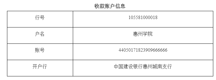 2、缴款方式及确认考试资格:一律采用电子汇款方式缴款。(费用在10月25日前汇入惠州学院财务处账户)。