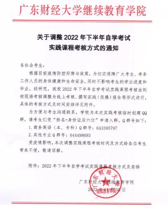 [广财]关于调整2022下半年自学考试实践课程考核方式的通知