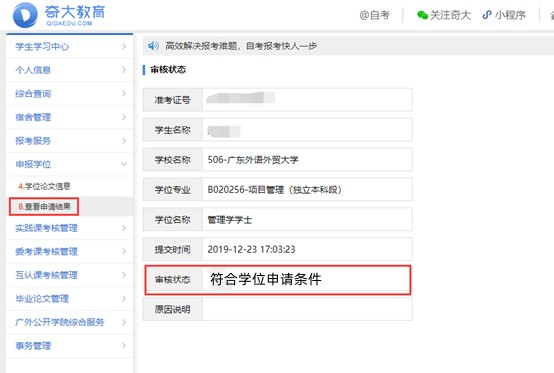 2、网上缴费时间:12月15日学位申请开始后,我办会陆续在系统上进行资料复审,请考生12月27日后在系统查看学位复审结果(如下图,仅供参考),审核状态为“符合学位申请条件”的考生,请于12月27日-12月29日按流程缴费(详见附件3网络缴费流程),逾期系统关闭,请及时缴费。不缴费者,将以自动放弃学位申请处理,后果自行承担。